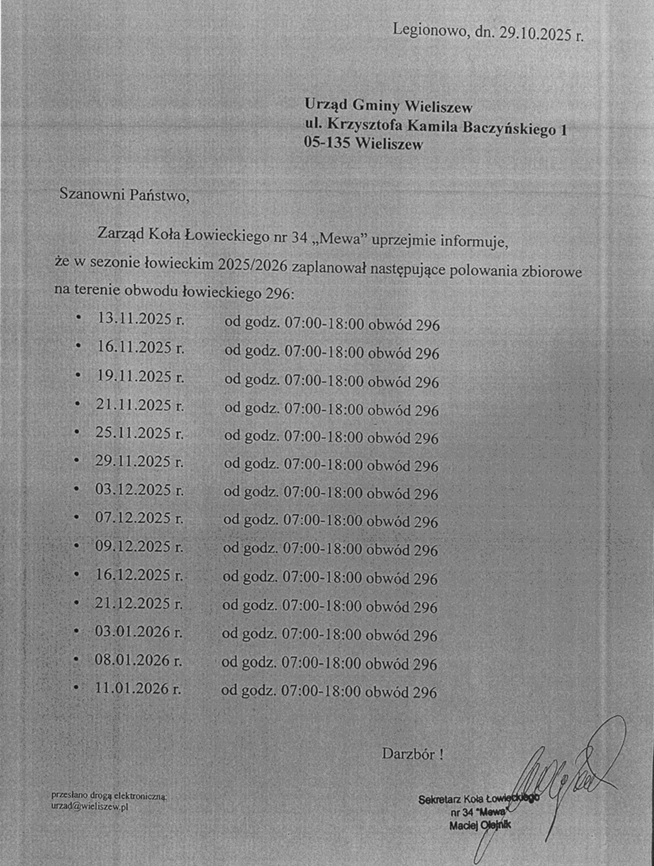 Zarząd Koła Łowieckiego nr 34 „Mewa” uprzejmie informuje,